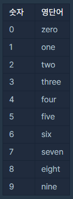 문제 대응표 네오가 프로도에게 숫자를 건넬 때 일부 자릿수를 영단어로 바꾼 카드를 건네주면 프로도는 원래 숫자를 찾는 게임입니다.