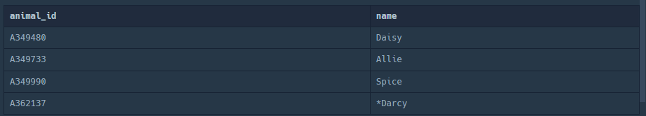 보호소에 들어올 당시에는 중성화1되지 않았지만, 보호소를 나갈 당시에는 중성화된 동물의 아이디와 생물 종, 이름을 조회하는 아이디 순으로 조회하는 SQL 문을 작성해주세요.SELECT *