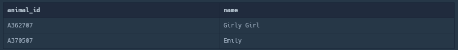 입양을 간 동물 중, 보호 기간이 가장 길었던 동물 두 마리의 아이디와 이름을 조회하는 SQL문을 작성해주세요.