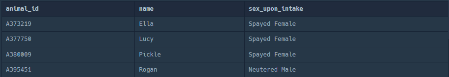 동물 보호소에 들어온 동물 중 이름이 Lucy, Ella, Pickle, Rogan, Sabrina, Mitty인 동물의 아이디와 이름, 성별 및 중성화 여부를 조회하는 SQL 문을 작성해주세요.SELECT ANIMAL_ID, NAME, SEX_UPON_INTAKE