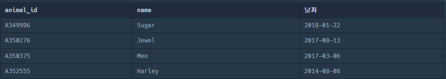 이때 결과는 아이디 순으로 조회해야 합니다.SELECT ANIMAL_ID, NAME, TO_CHAR(DATETIME, 'YYYY-MM-DD') AS 날짜